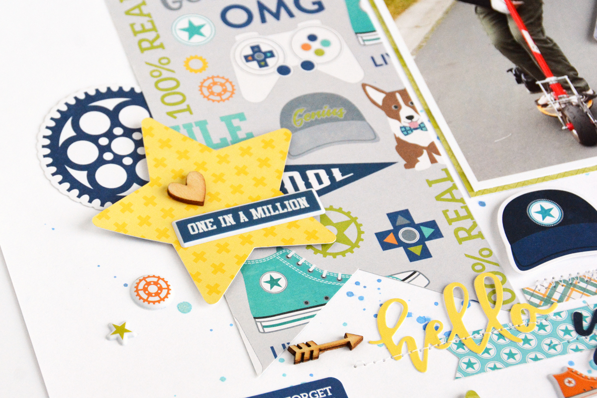 I had loads of fun creating this layout. It has so many awesome embellishments that I thought it would be fun to arrange them in rows along with strips of pattern papers. I especially love those little
